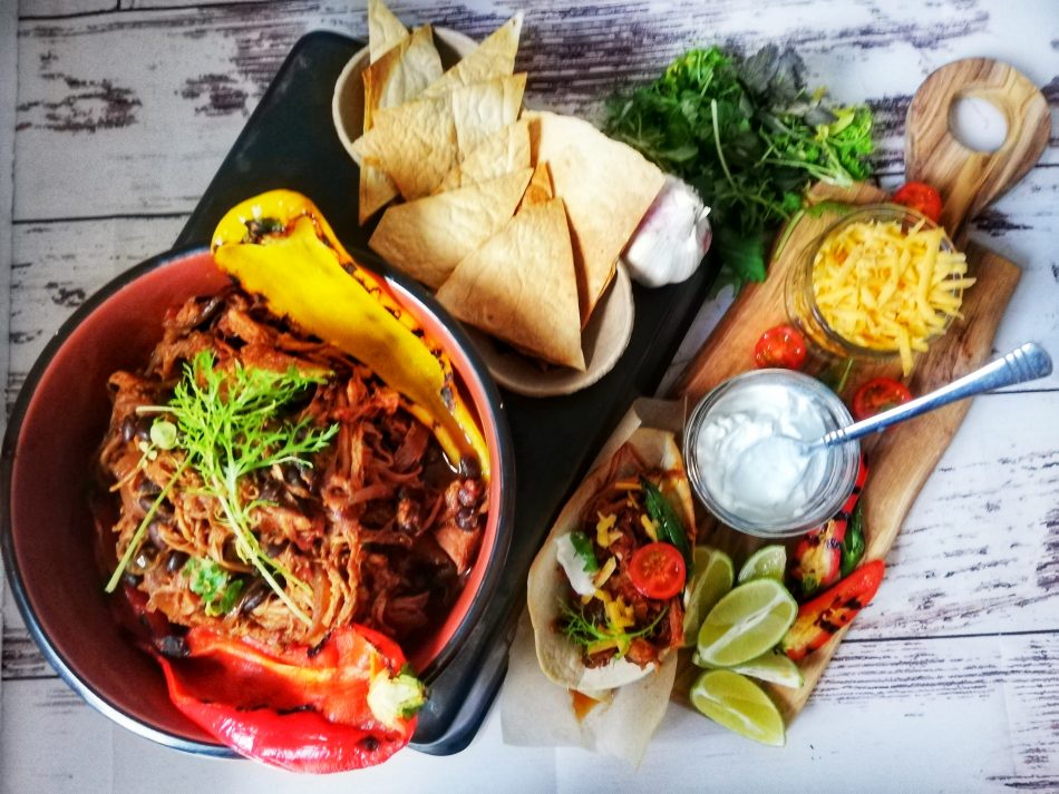 Slow cooked pulled bacon with chorizo, & black bean chilli