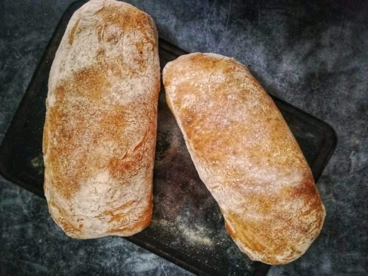 - Pop a baking sheet, upside down, into the oven to heat up, then working quickly & safely remove, dust with flour, then gently pick up one of your ciabatta doughs and lay it down on the tray. Spray with water and place it in the oven to bake for approx. 20-25 min, turning around halfway to achieve an even colour until golden and sounding hollow when tapped on the bottom. Repeat with the second piece of dough if your oven was not big enough to take both at the same time.