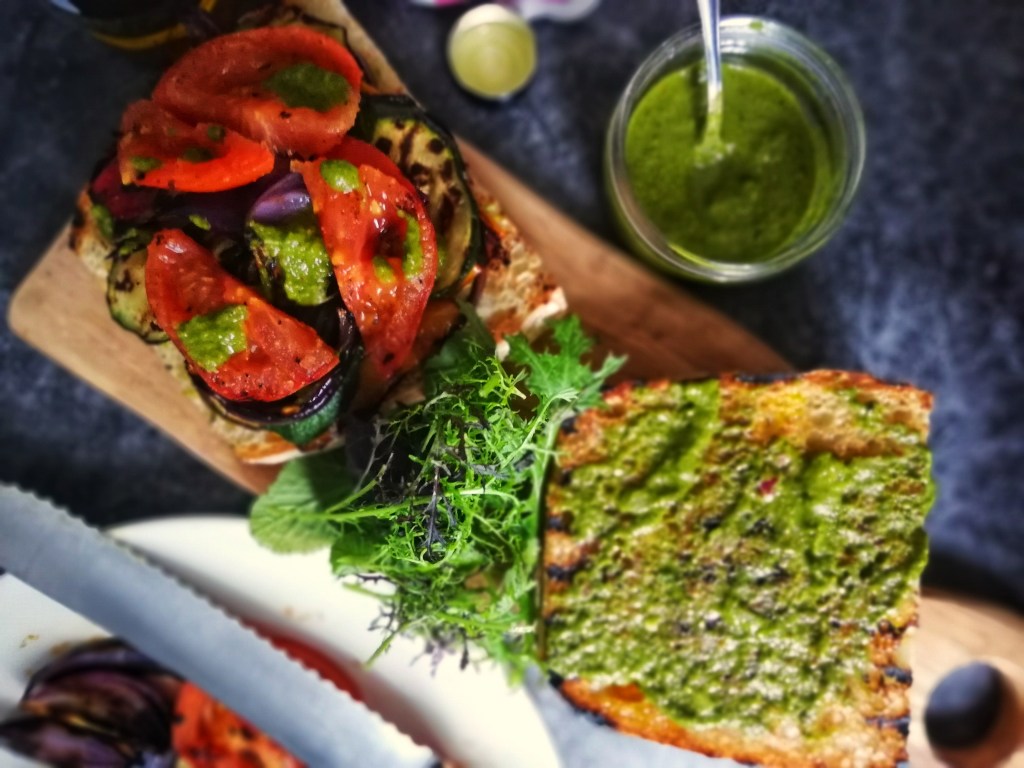 Citrusy purslane dressing, with grilled vegetables on crispy ciabatta