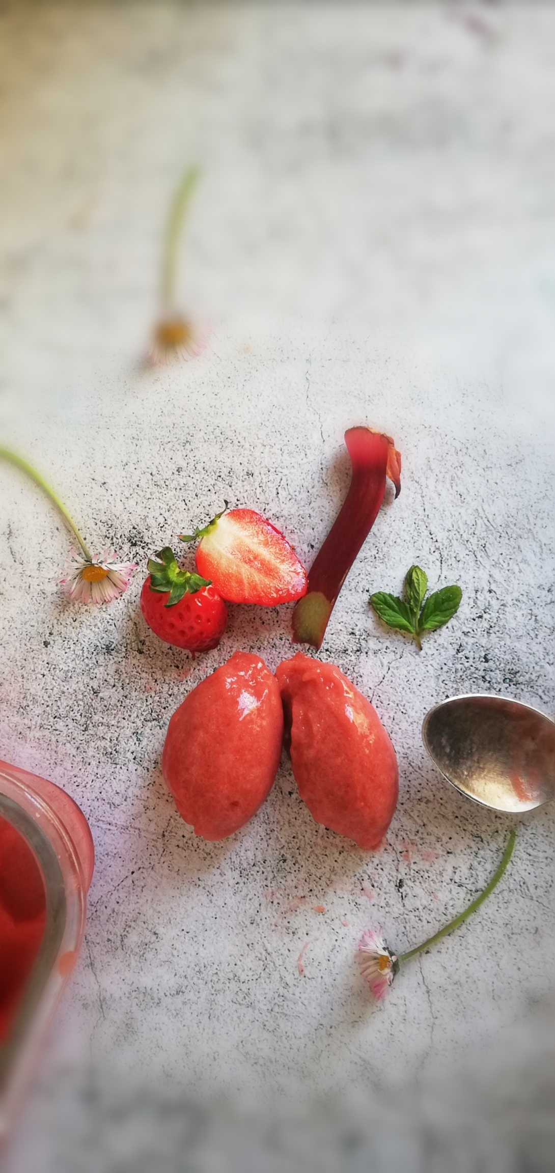 Thinking of something to serve along with the shortbread, this simple sorbet recipe was the perfect partner with strawberry season in full swing here in Ireland and of course to balance the sweetness, some rhubarb was the perfect partner.