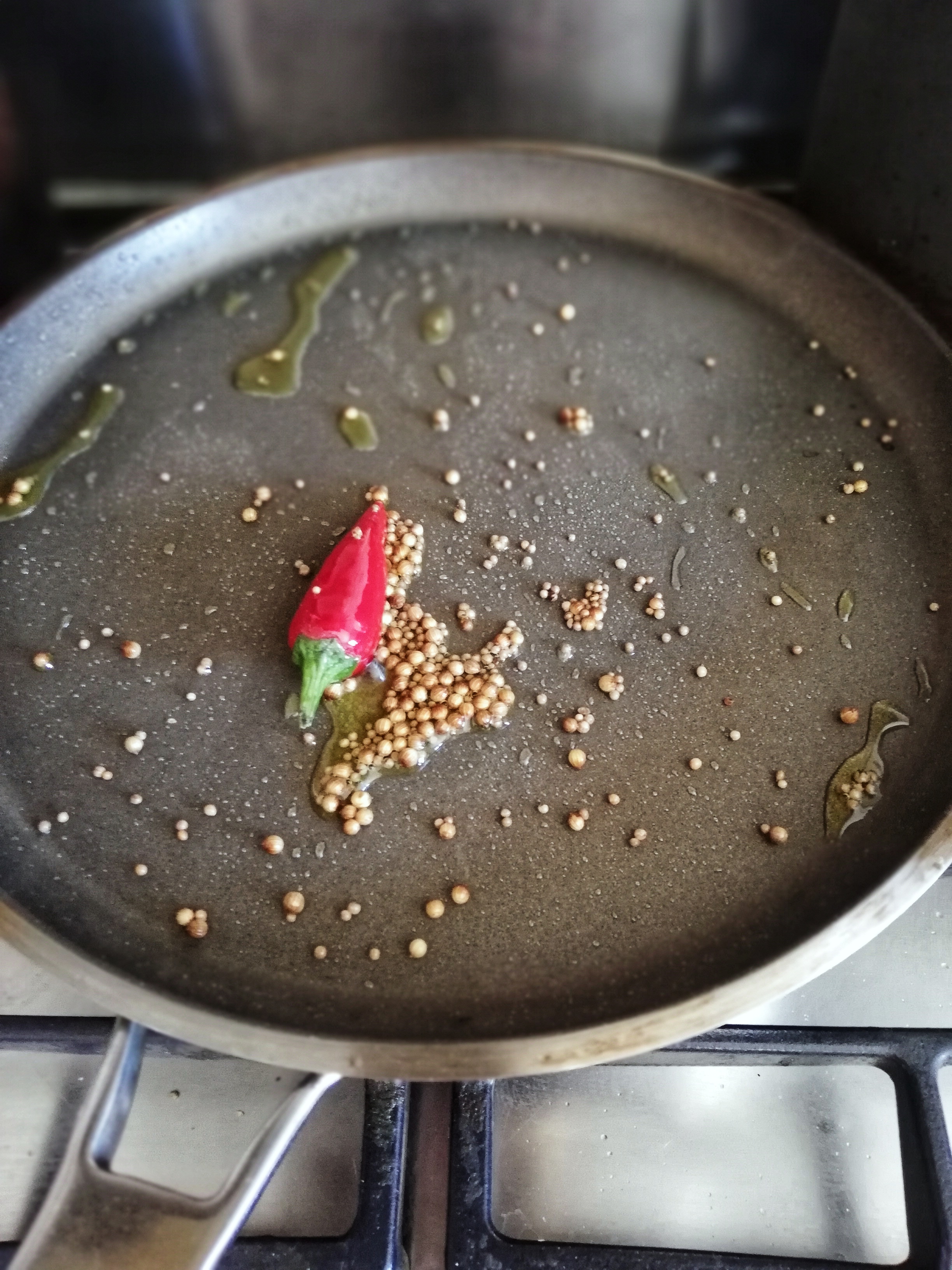 - Temper the spice seeds in 1 x tbsp of oil which has been pre-heated to medium hot, along with one chilli and the lightly crushed garlic-when the seeds pop, they are ready-be careful they don’t burn, or you will have to start again. Ground in a pestle and mortar. If using ground spices, it only takes a few seconds or if combining both – seeds first, and then ground. This is a great technique for releasing their flavour.