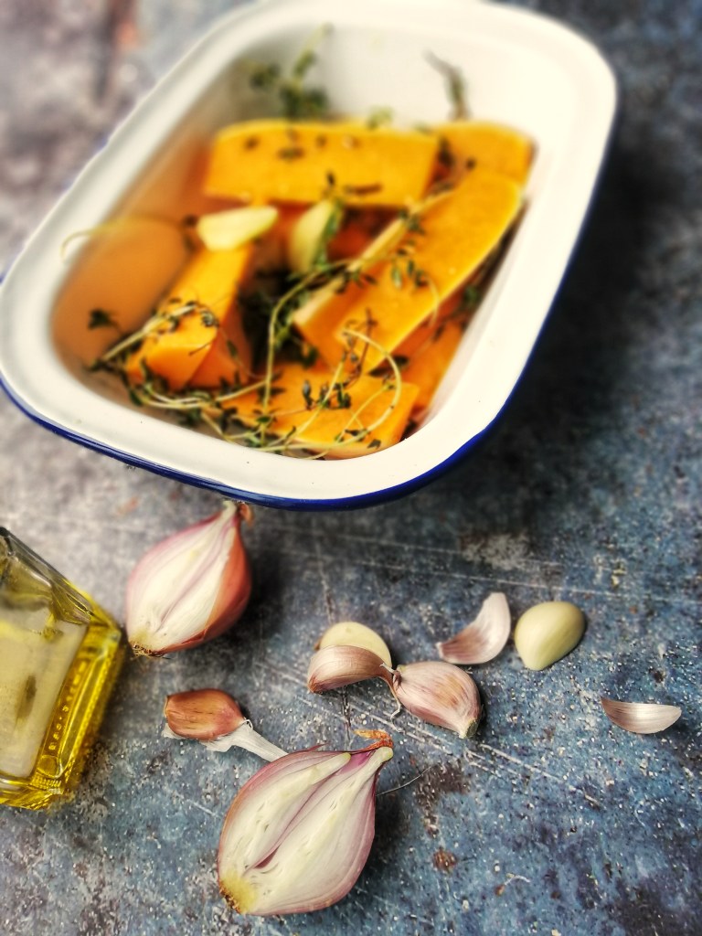 - When the squash is ready, remove from the oven and set aside the ginger, garlic & shallots which will form part of the dressing.