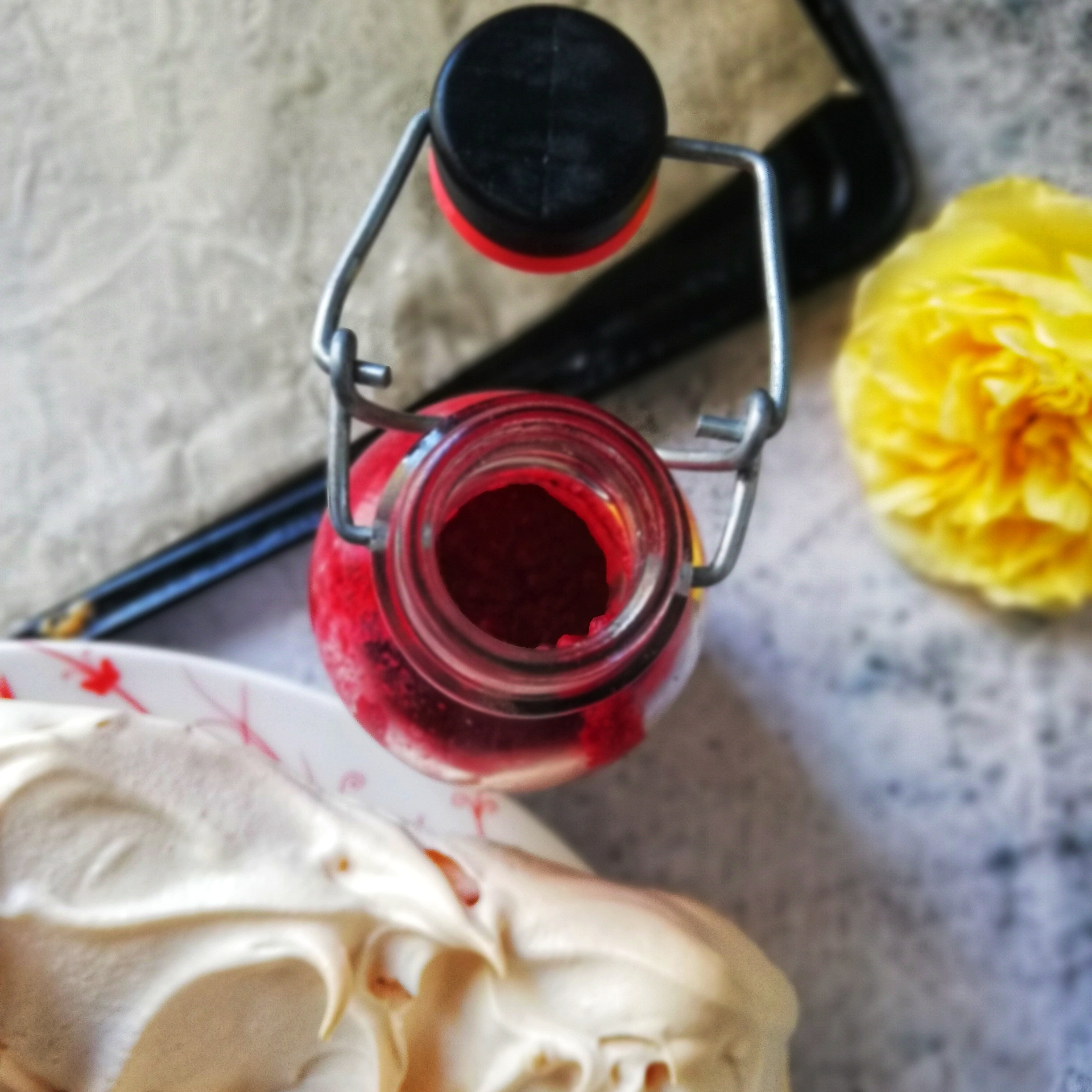 Strawberry & raspberry pavlova, berry sauce & rose petals