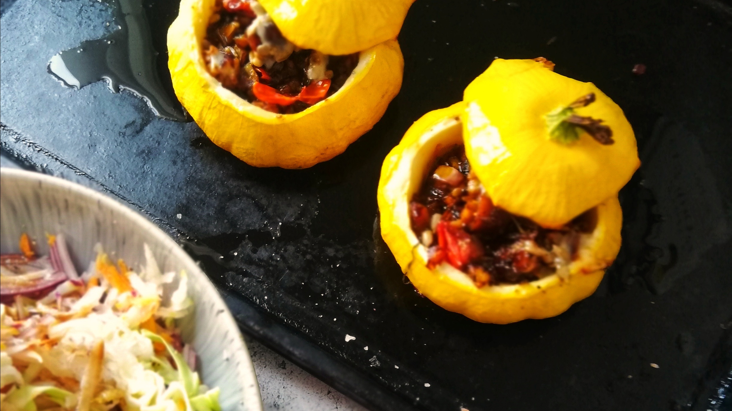 Summer patty pan squash filled with aubergine & date filling with kolhrabi & carrot slaw