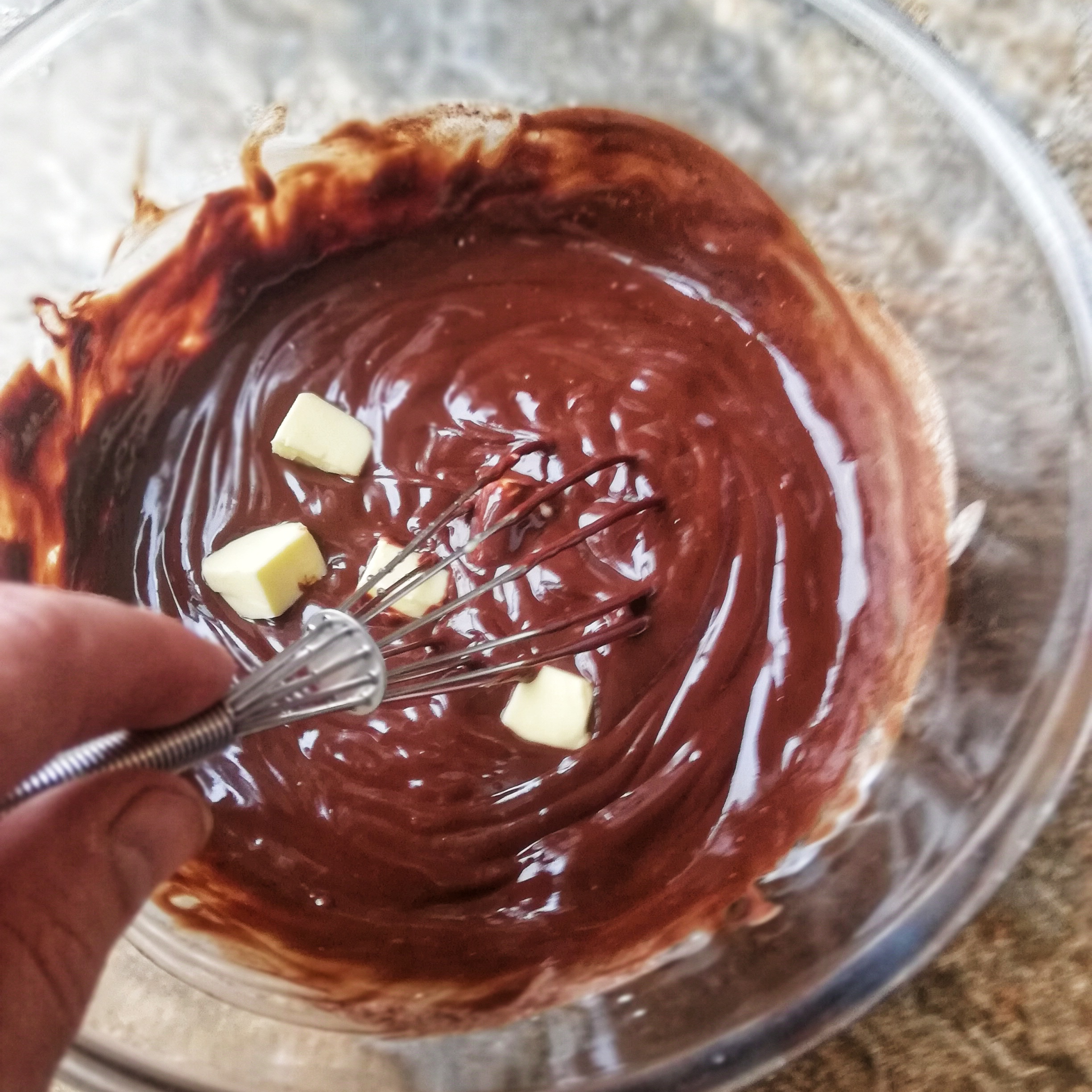 - Remove from the heat, using a hand whisk, incorporate the cream into the chocolate until smooth and blended. Whisk in the glucose and butter until silky smooth and glossy.