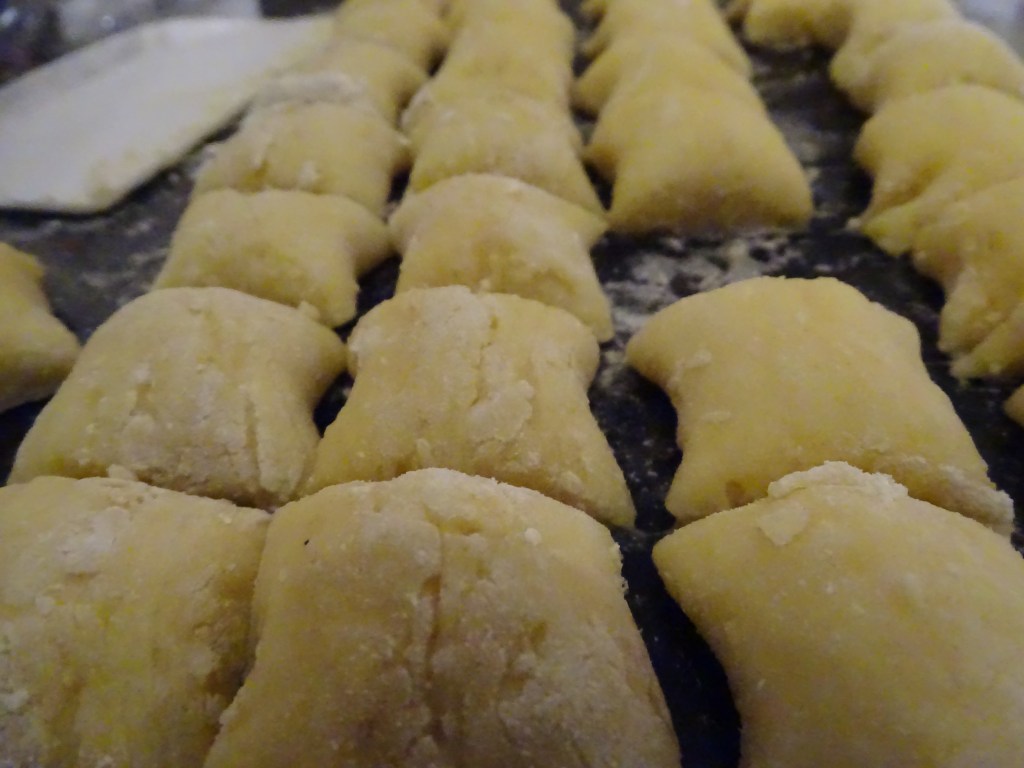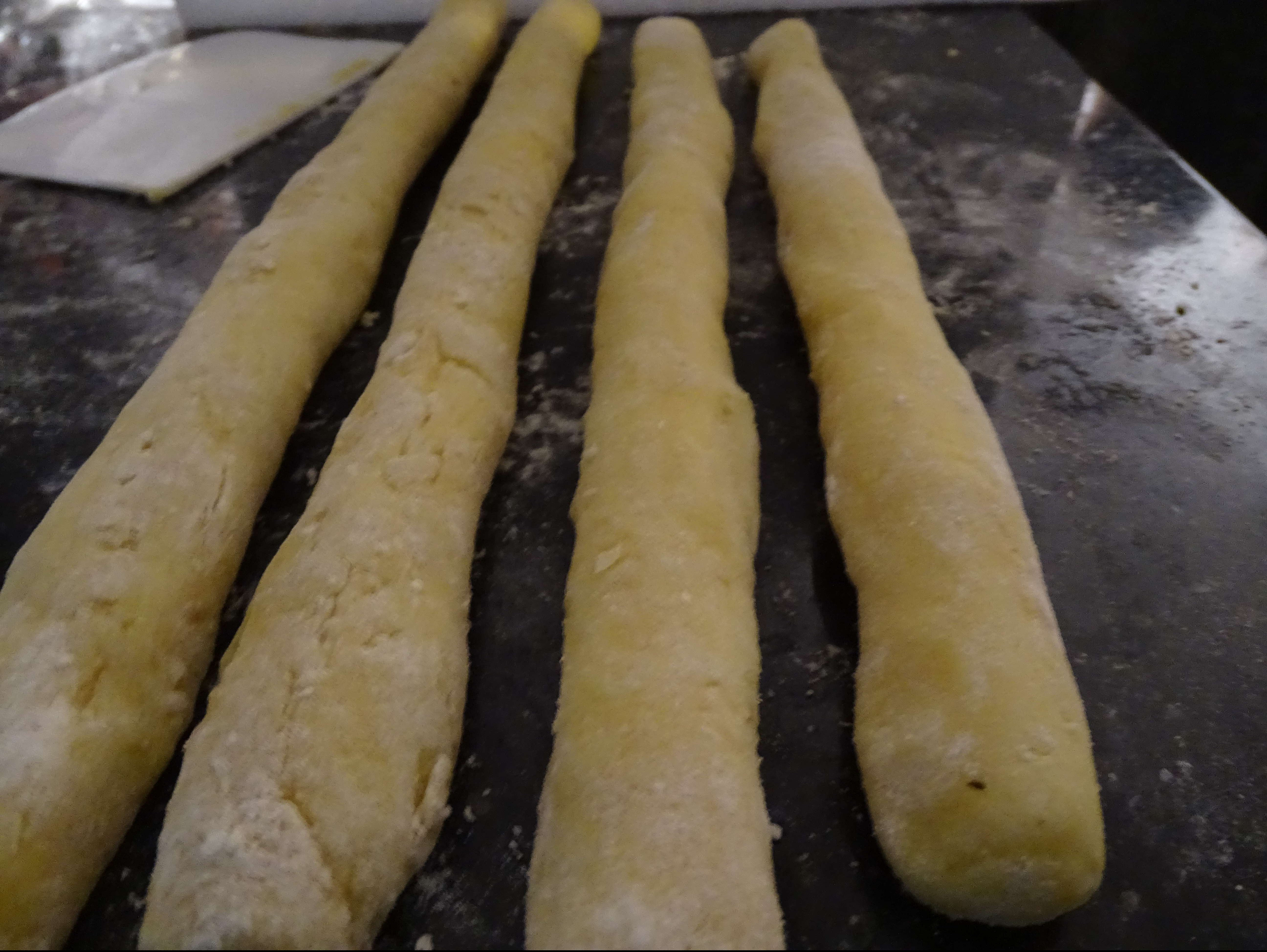 - Roll out into long strips with your hands, lightly dusting with flour as required. Cut into 1.5cm lengths approx., place on a lightly floured baking parchment on a tray and cover with a clean tea towel or cling film.