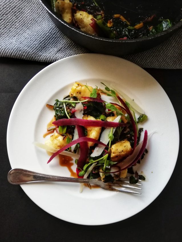 Sevilla or blue Anneliese potato gnocchi with wilted rainbow chard, garlic brown butter, parmesan & balsamic