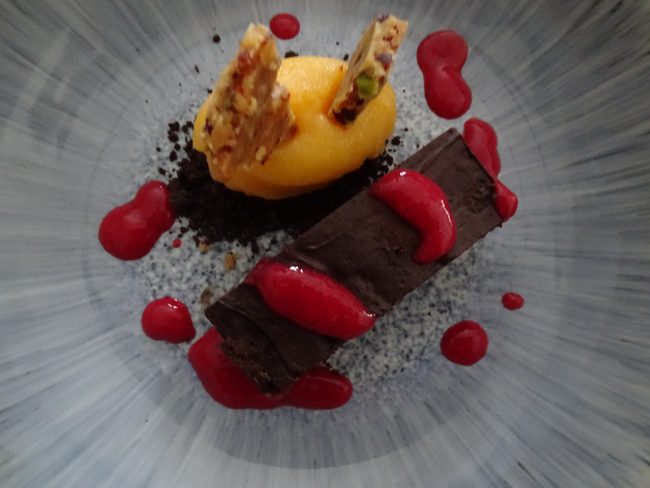 Chocolate Marquise, Clementine Sorbet, Peanut Rayu Brittle, Raspberry puree
