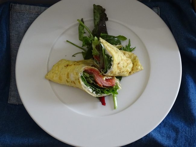 - Spread the egg wraps with cream cheese which has been blended with the dill or chives, top with smoked trout, few hanfull of mixed leaves, sprinkle with baby capers.