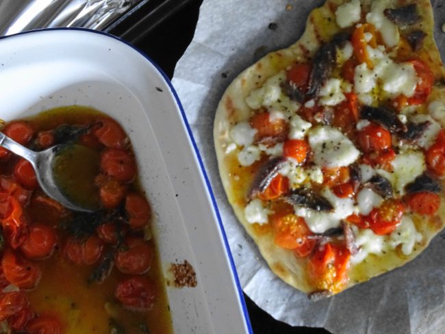 - Spoon over the tomatoes over the flat bread, not to much juice, then place the goats cheese on top and anchovies if using.