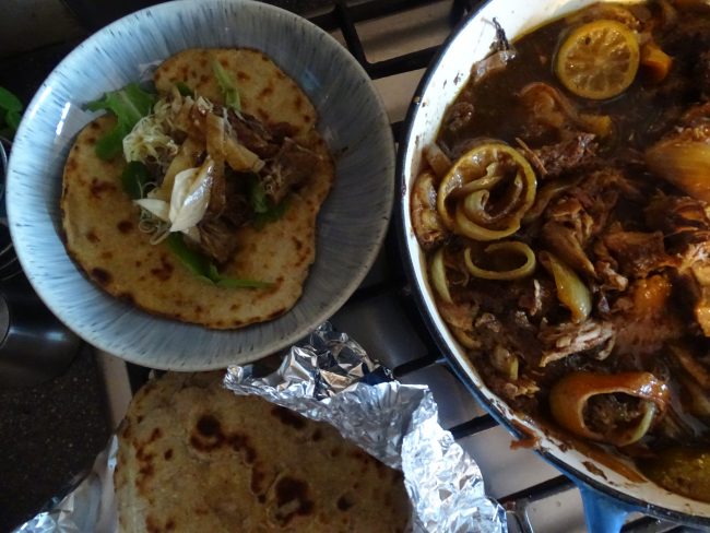 - To cook, place onions, lime and apple in bottom of roasting tray, put meat on top, season well, with freshly ground pepper & sea-salt, pour enough water to cover the bottom of a roasting tray, then cover with parchment and tin foil, place in pre-heated low temp ’oven 150/c gas 2 and place in the oven for approx. 3½ hours,
